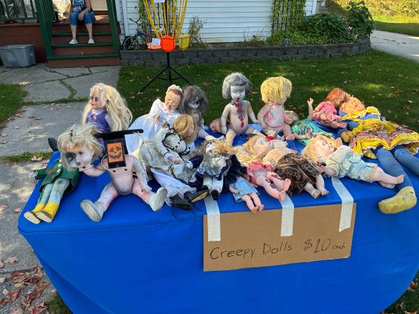 Costumes. Various sizes and styles. Creepy dolls Decorations Prices vary. 825 broadway st. Sheboygan Falls