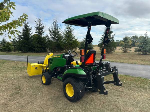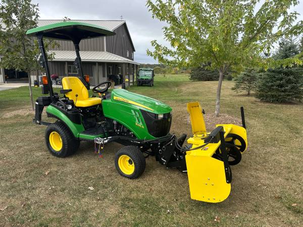 JD 1025 R compact utility tractor, 360 hrs. 2021 54” front mount snowblower, like new. Canopy, rear quick hitch. Always stored inside, everything works as it should.
