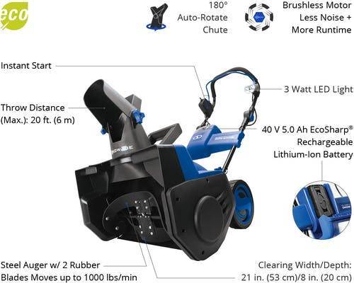 This is the larger single stage snowblower Snow Joe makes. With a bigger electric brushless motor, a 21" clearing path, and a more powerful battery, it can clear 25% more snow than their 18" machine.